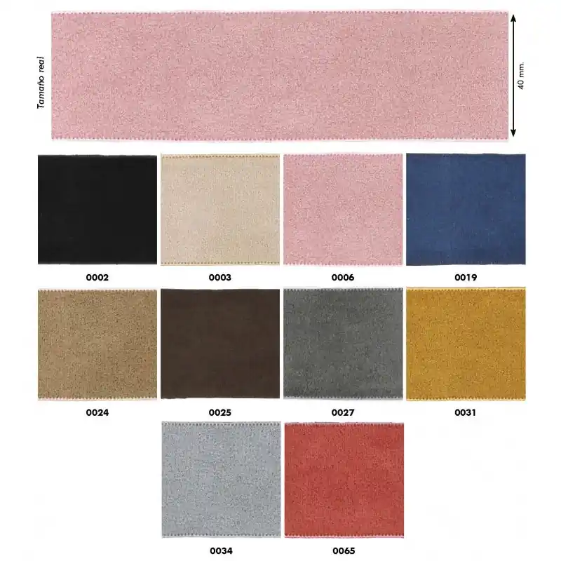La Cinta de Antelina de 4 cm es una cinta decorativa fabricada 100% en poliéster, que imita la textura suave y aterciopelada de la antelina. Ideal para lazos, decoración y accesorios, se vende por metros, con un ancho constante de 40 mm. Está disponible en una amplia gama de colores, incluyendo 0002 Negro, 0003 Crudo, 0006 Rosa, 0019 Azulón, 0024 Beige, 0025 Marrón, 0027 Gris medio, 0031 Dorado, 0034 Gris claro y 0065 Teja, ofreciendo gran versatilidad para diversos proyectos creativos.