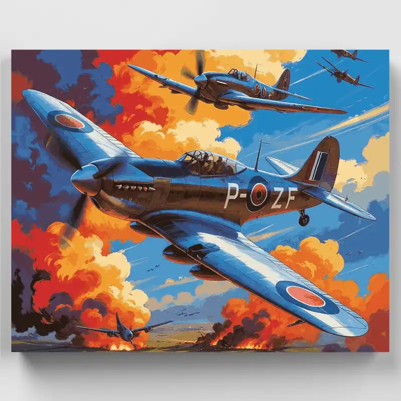 Transforma tu espacio con este dramático kit de pintar por números de aviación de la Segunda Guerra Mundial. La obra de arte captura el intenso momento de los Spitfires de la RAF en acción, mostrando el icónico avión P-ZF surcando un cielo dramático lleno de nubes anaranjadas y acción de combate. El sorprendente contraste entre el avión azul, las explosiones ardientes y el paisaje rural a cuadros que se extiende debajo crea una composición poderosa y dinámica que da vida a la historia.¿A Quién Le Encantará?Este kit es perfecto para entusiastas de la aviación, aficionados a la historia militar y cualquiera que aprecie el arte histórico dramático. Ya seas un pintor principiante que busca crear algo significativo o un artista experimentado atraído por las imágenes bélicas, este proyecto desafiante pero gratificante te mantendrá entretenido. ¡Comienza tu viaje artístico hoy y recrea esta poderosa pieza de la historia de la aviación!