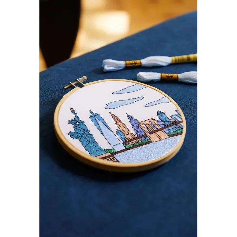 Revive el skyline más famoso del mundo con este espectacular kit de bordado de Nueva York, creado por la ilustradora textil Kseniia Guseva. Con un estilo limpio y colorido, este proyecto intermedio te permitirá bordar monumentos emblemáticos como la Estatua de la Libertad, el One World Trade Center, el Puente de Brooklyn o el Empire State Building, capturando la esencia vibrante de la ciudad que nunca duerme.Este kit completo de bordado contiene todo lo necesario para comenzar: tela impresa con el diseño, hilos Mouliné DMC, aguja, instrucciones detalladas y un bastidor de madera de 14,5 cm de diámetro que también sirve como marco decorativo. Es ideal para quienes desean avanzar en su técnica y disfrutar de una experiencia creativa mientras construyen punto a punto un paisaje urbano inolvidable.Perfecto como regalo, decoración o souvenir bordado de Nueva York.