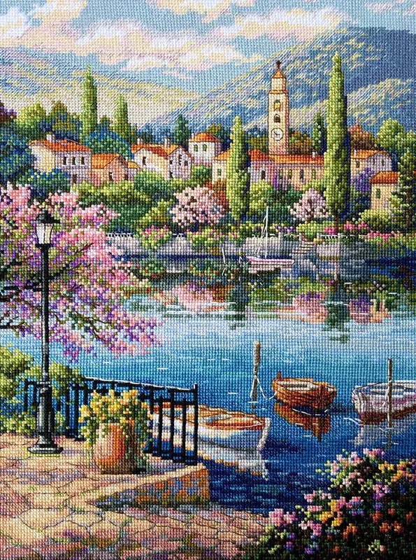 El kit de punto de cruz completo «Village Lake Afternoon» de Merejka (K-204) incluye tela Aida 16 ct. de Zweigart en color blanco, 40 colores de hilos Moulinè DMC de 100% algodón, una aguja John James, un gráfico en color y instrucciones detalladas. Con medidas de 21,5×28,5 cm, este kit de calidad premium representa una escena de un pueblo y un lago en una tarde, con casas y barcos alrededor y un cielo hermoso. Es perfecto para crear una hermosa decoración con un toque de la naturaleza y la tranquilidad de un pueblo.
