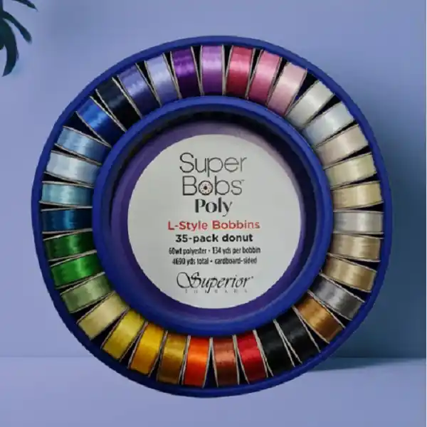 Te presentamos este kit de hilos de poliéster que se llama Super Bobs-poly y pertenece a una marca tan reconocida como es Superior Threads. Este kit incluye 35 bobinas de hilo de poliéster del nº 60wt con lados de cartón, colocadas en un Bobbin Saver, un donut súper práctico que te permite mantener tus bobinas colocadas y ordenadas de manera práctica y cómoda. El tamaño de cada bobina es de 134 yardas que equivalen a 122 metros aproximadamente.