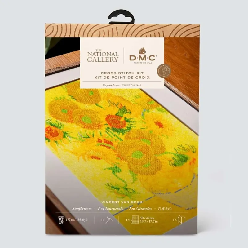 Kit de punto de cruz de la pintura de Van Gogh «Los girasoles» de la colección de la National Gallery de Londres. Los colores corresponden a las pinturas originales. Nivel: experto. Dimensiones: 29×36.5cm. Tela Aida 5,5 pts/cm.