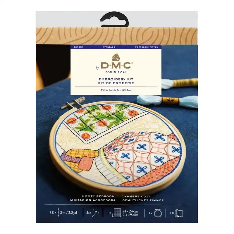 – Este kit utiliza una selección de puntadas para bordar este acogedor diseño de Karin Fast. Las diferentes texturas y los estampados en capas crean una escena hogareña en el dormitorio.