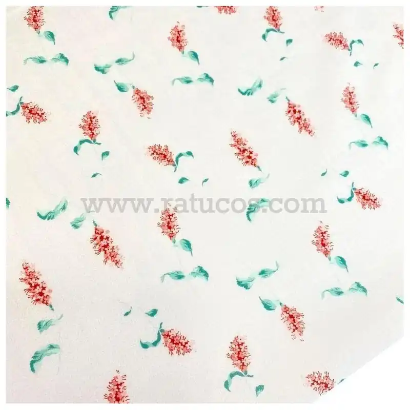 Tela de batista de algodón con estampado de pequeñas flores en tonos marsala y verde. El fondo está formado por diminituos puntitos en color verde a juego con las hojas y las ramas de la flor.