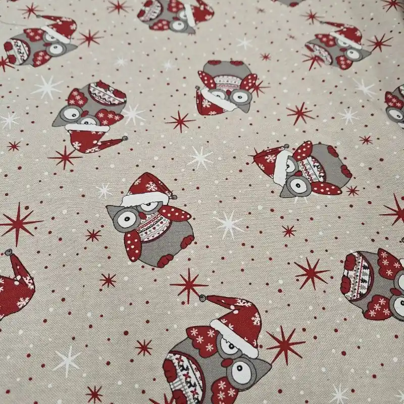 Loneta de fondo color arena y estampado de simpáticos búhos navideños