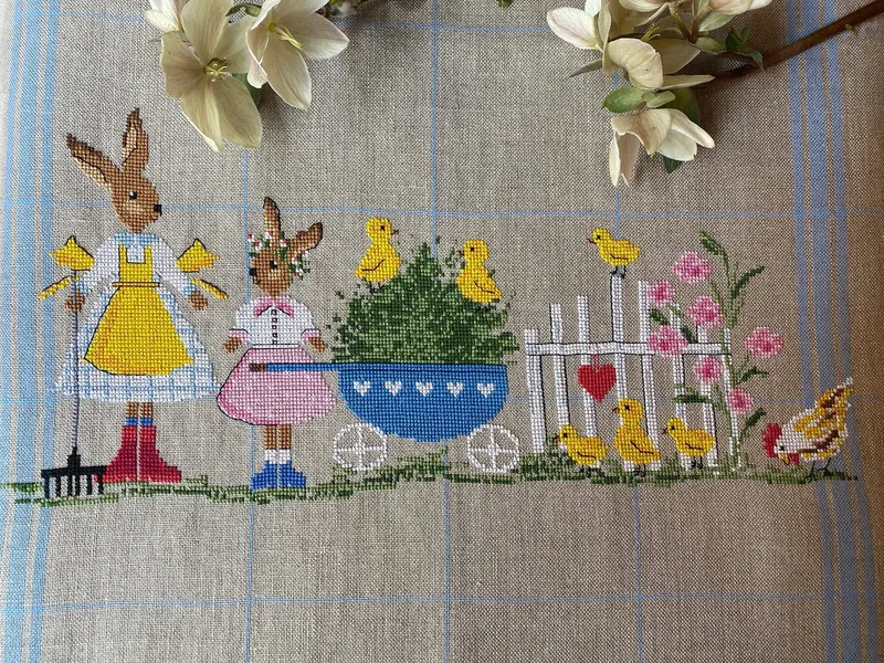 Esquema de punto de cruz contado con motivo de Pascua, ideal para personalizar toallas de cocina y otros textiles del hogar.