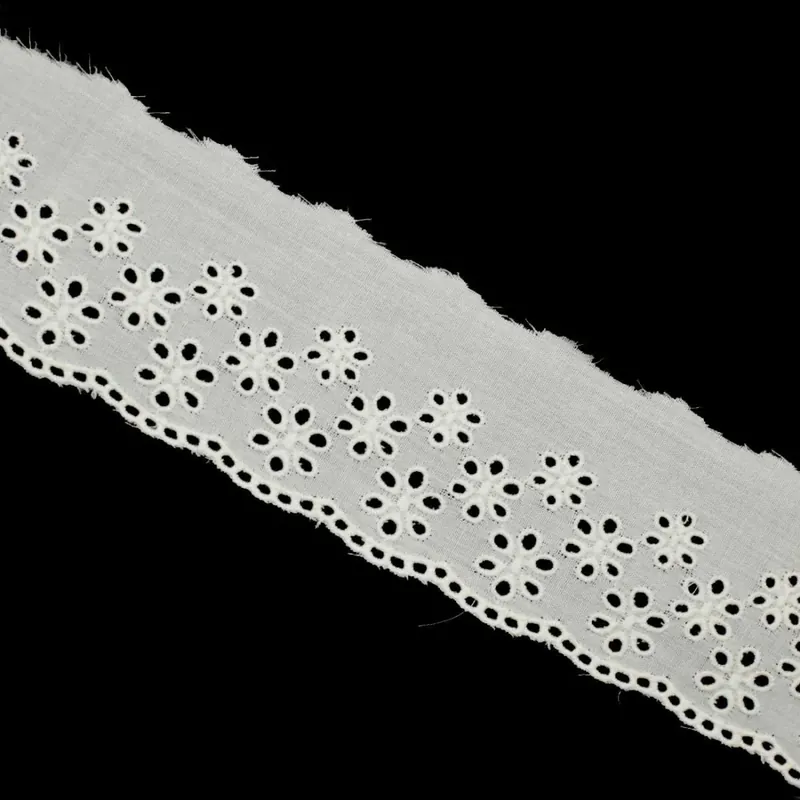 Puntilla de tira bordada 100% Algodón disponible en color blanco y color crudo. Tiene un diseño muy elegante, con flores caladas. Mide 5cm de ancho total. Este entredós es perfecto para poner sobre todo tipo de prendas o incluso para decorar tu hogar. Podrás utilizarlo como elemento decorativo en prendas infantiles, camisas, juegos de cama o cuna, trajes regionales, etc. Precio por metro. El encaje se enviará sin ningún corte salvo que la cantidad solicitada sea superior a 13 metros.