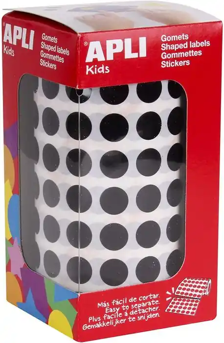 Rollo de gomets redondos de tamaño Ø 10,5 mm en color negro con adhesivo permanente. Cada rollo contiene 59 hojas pretroqueladas para una fácil separación, un total de 5.192 gomets por rollo. El formato perfecto para usar en escuelas, guarderías, talleres infantiles o cualquier otro colectivo que trate con niños. Jugar y crear con gomets es una actividad básica que permite desarrollar la psicomotricidad fina y trabajar, al mismo tiempo, varias capacidades y habilidades como el conocimiento de los colores, las formas geométricas y los tamaños; el desarrollo de la lógica y la creatividad; el trabajo en equipo o el dominio del espacio, entre otros. Además, los gomets APLI cumplen con las más estrictas normas de calidad y seguridad.