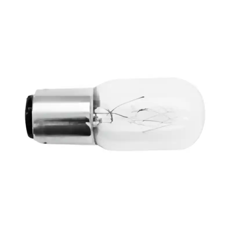 Bombilla incandescente de bayoneta corta 15W, ideal como repuesto para máquinas de coser y electrodomésticos que utilizan este tipo de casquillo. Su formato reducido permite colocarla en espacios estrechos donde no cabe una bombilla de rosca. Compatible con modelos de máquina de coser ELNA 1000, garantizando iluminación directa y clara en la zona de trabajo.