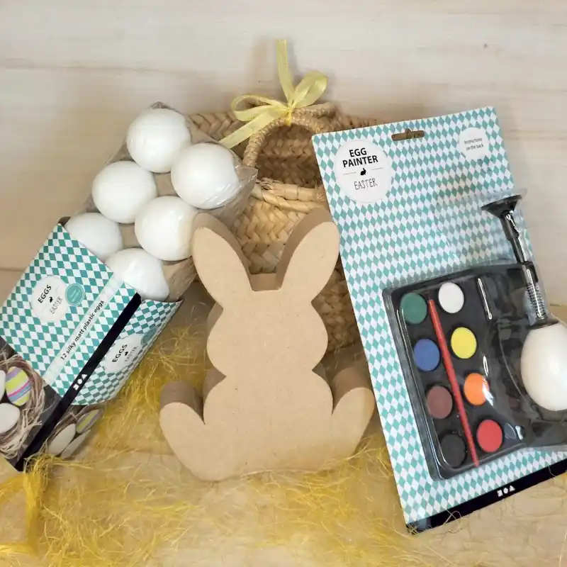 Con este kit disfrutarás mucho estas vacaciones de Pascua. Pinta tu capazo perfecto para recoger los huevos de la gran búsqueda de huevos de Pascua, decora tus propios huevos y pinta un precioso conejo.