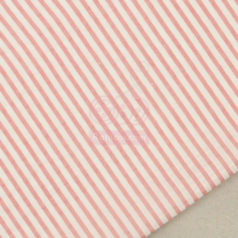 Tela de algodón con textura y estampado de rayas verticales blancas y coral.