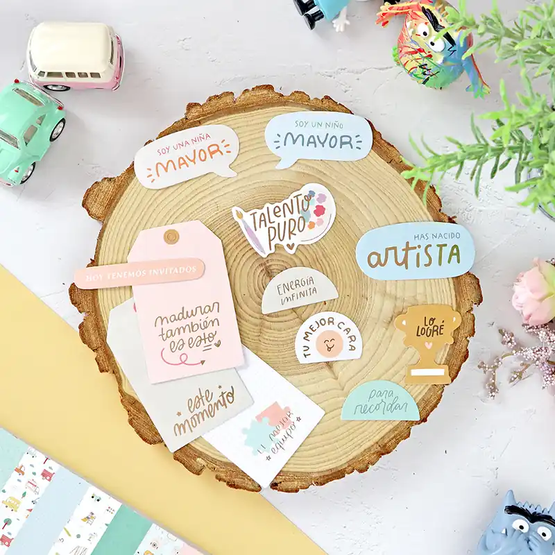 Los papeles te valdrán para preparar todo tu proyecto y luego para documentarlo cuentas con adornos a juego, con los colores y diseños de la colección. Con ellos ya puedes personalizar el álbum para un niño o una niña, o mantenerlo neutro.