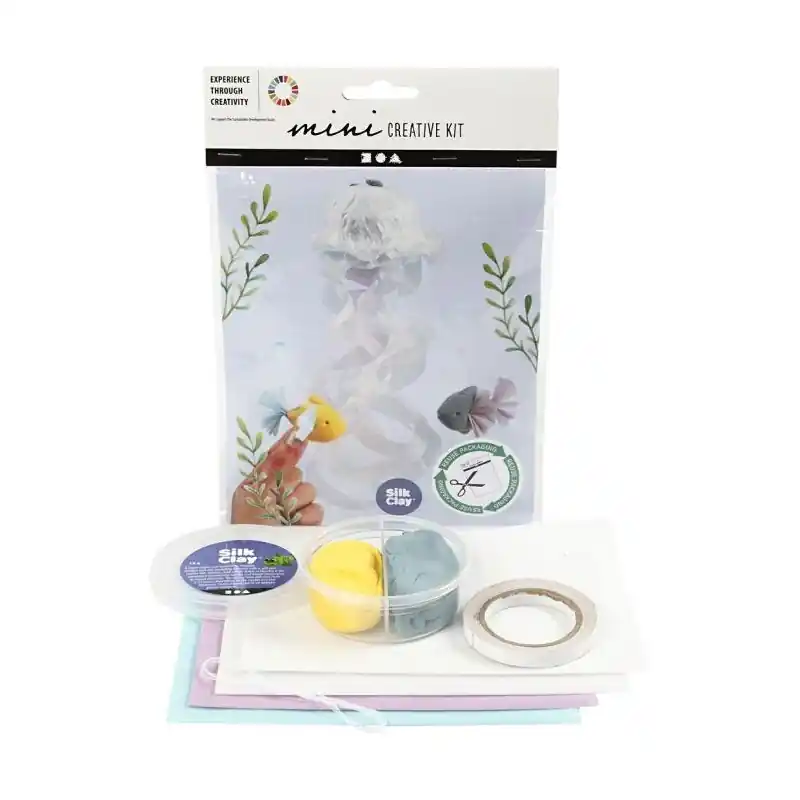 Kit de materiales para hacer una medusa y un pez de Silk Clay y papel tisú. Utilice la Cuba de embalaje para el cuerpo y corte la bolsa para hacer los tentáculos. Instrucciones incluidas.