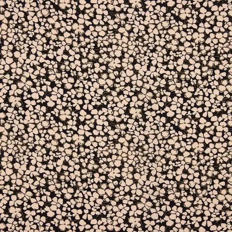 Descubre la sofisticación de la tela de crepe viscosa estampada Floral Retro Beige, con un encantador estampado floral mini en beige sobre fondo negro, una combinación clásica y atemporal que eleva cualquier prenda.