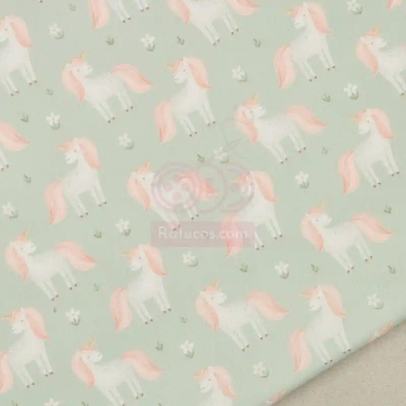 Tela de popelín estampada con unicornios y flores, sobre un fondo color también estampado en tono verdoso.