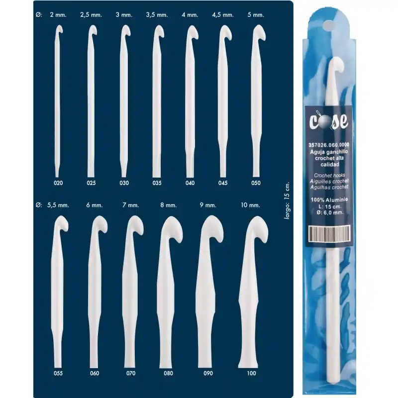 Las agujas de ganchillo COSE están fabricadas en aluminio de alta calidad, ofreciendo una herramienta ligera y duradera para tus labores de crochet. Disponibles en una amplia gama de tamaños, estas agujas se adaptan a diferentes grosores de hilo, permitiendo una mayor versatilidad en tus proyectos.