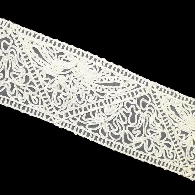Entredós de guipure en color marfil. Mide 9cm de ancho total. Este entredós de guipure es perfecto para decorar o customizar tus prendas o accesorios. Ideal para coser sobre vestidos o trajes regionales. Ideal también para poner sobre colchas o elementos de tapicería. Tiene un bordado de gran calidad. Composición: 100%VI. Precio por metro.
