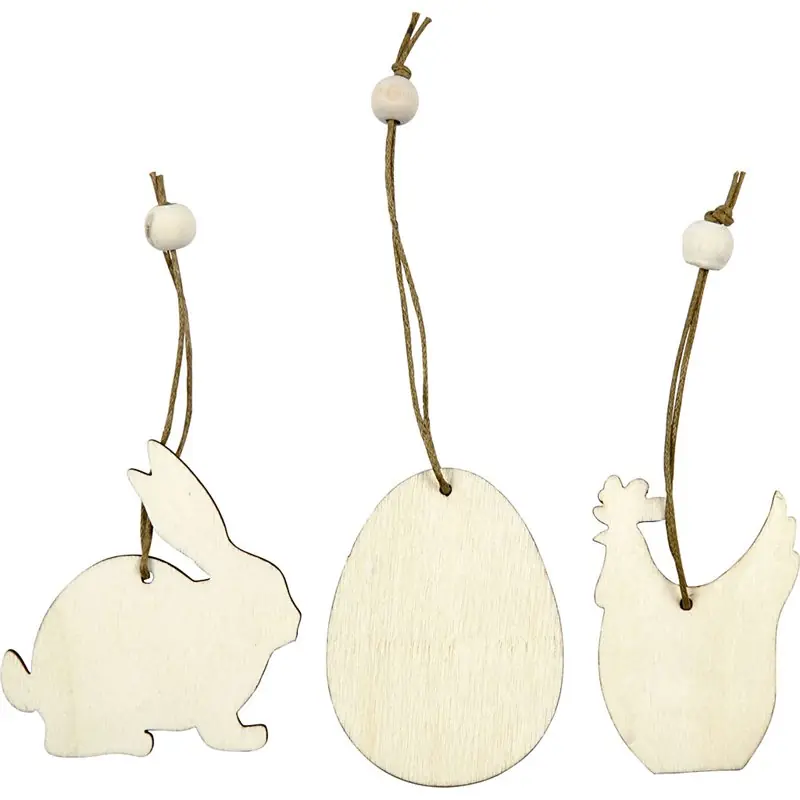 Ornamentos de madera, conejo, huevo, gallina, medidas 6 cm, grosor 3 mm, 9ud