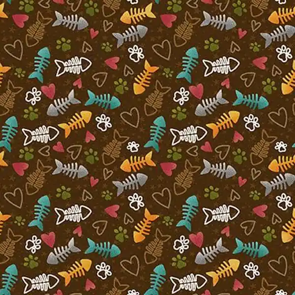 Esta tela Live Love Meow está diseñada por Leanne Anderson y pertenece a la colección Whole Country Caboodle, inspirada en las mascotas. Esta tela cuenta con un colorido estampado de espinas de pescado, huellas y corazones.