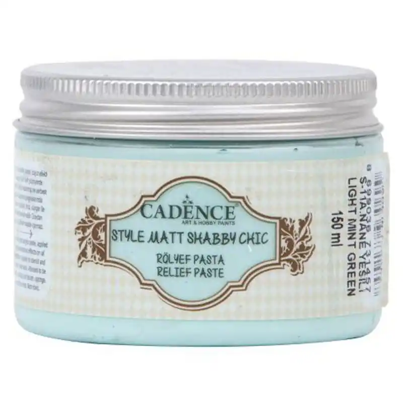 Pasta SHABBY CHIC Menta Claro Cadence 150 ml. Pasta de relieve al agua CADENCE con acabado MATE para dar un efecto muy original de relieve o volumen a tus trabajos manuales de estilo Shabby Chic. Aplicar sobre superficies rígidas usando stencils, espátula, pincel o esponja.