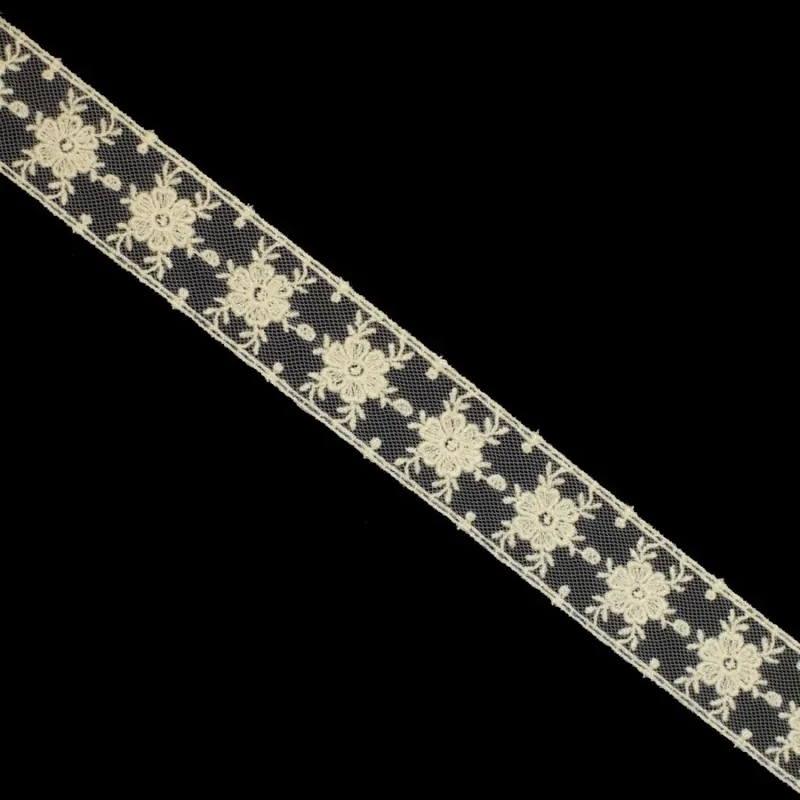 Entredós de tul bordado disponible en color blanco y color beige. Mide 2.5cm de ancho. Este tul bordado es ideal para customizar todo tipo de prendas. Perfecto para vestidos, camisas y trajes de ceremonia. El tul bordado es muy utilizado para alargar prendas e incluso para decorar. Acabado de gran calidad. Precio por metro.