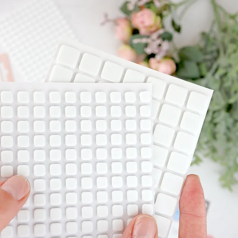 En scrapbooking usamos este foam para elevar decoraciones que queremos destacar, crear juegos de volúmenes, añadir dimensión en tarjetas, páginas de scrapbooking, mix media… También puedes decorar la parte exterior del adhesivo con purpurina, arenas de colores, polvos de emboss y cualquier elemento pulverizado que imagines.