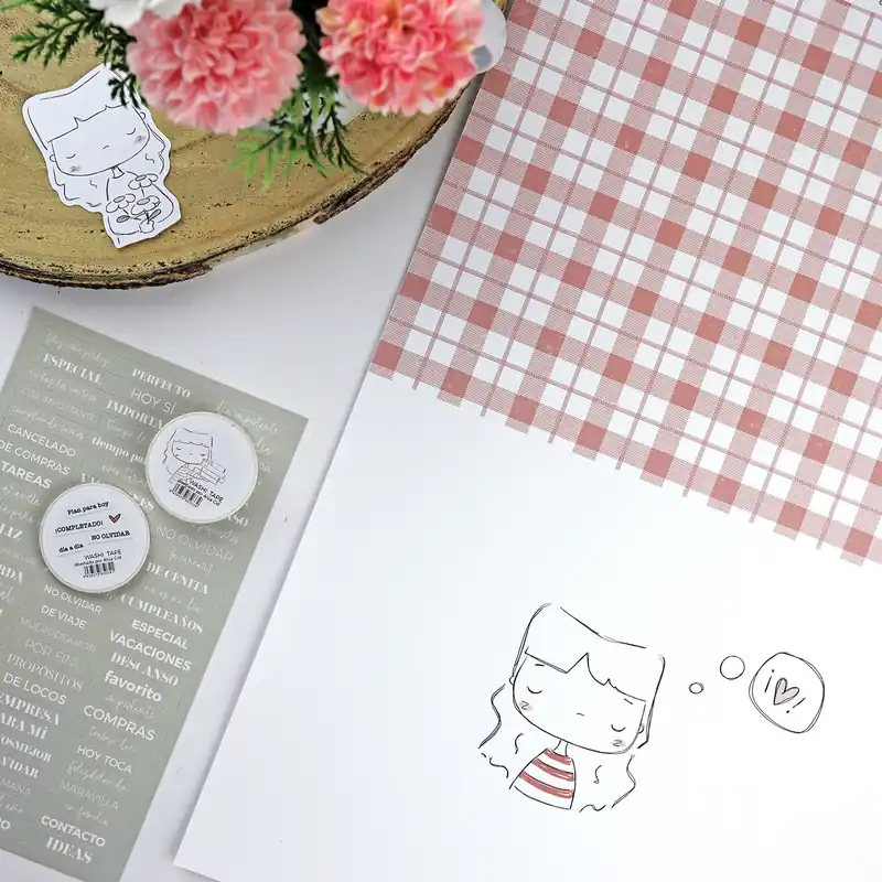 El papel se divide en dos diseños diferentes: la mitad lleva una pensativa ilustración y la otra un patrón de cuadros tipo tartán, en colores blancos y rojos.