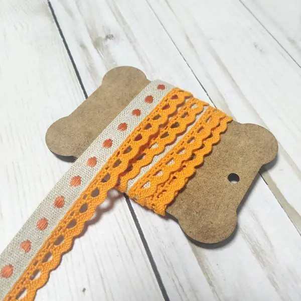 Es una cinta de color beige con detalles en forma de lunares en color naranja y rematada con una pequeña puntilla. Está fabricada 50% algodón – 50% poliester y mide 20mm de ancho.