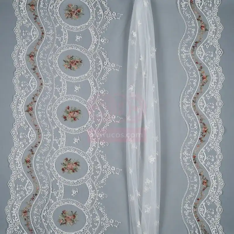 Tul bordado en color blanco natural y bordados tipo punto de cruz en tonos rosas y verdes.