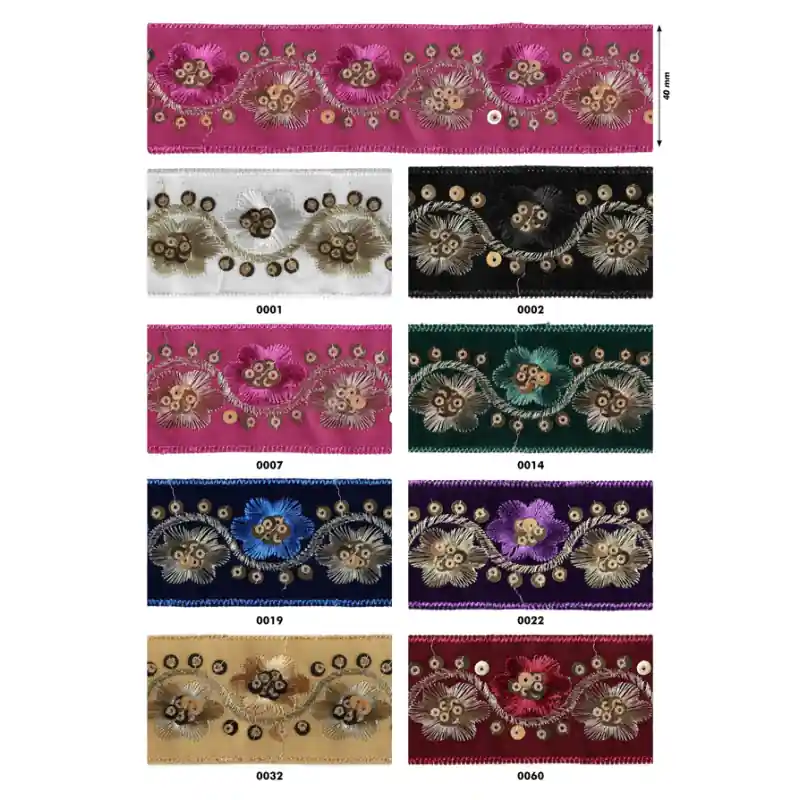 El tapacosturas bordado de fantasía es una cinta textil decorativa de 40 mm de ancho, con bordado floral metalizado e incrustaciones de lentejuelas que aportan un toque de brillo y elegancia.