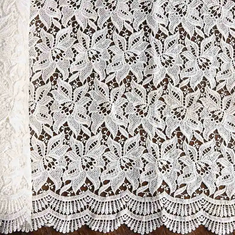 Tejido guipur en color blanco con diseños de calado formando flores.