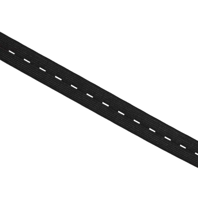 Cinta de goma elástica con ojales disponible en color blanco y color negro. Mide 22mm de ancho total. Es una cinta muy versátil que podrás utilizar en cualqier prenda o accesorio. Especialmente útil para pantalones o faldas. Sirve para adaptar la prenda a la cintura poniendo el botón en el ojal que se desee. Precio por metro.