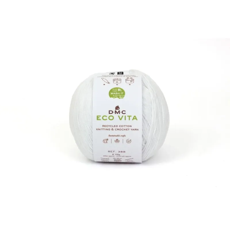 DMC nos presenta su nueva calidad de lana ECO VITA. Este ovillo es perfecto para hacer todos los proyectos que te imagines en punto y ganchillo. Se trabaja muy fácil con esta calidad de hilo, resistente y muy vistoso. Disponible en una gran gama de colores perfectos para hacer todo tipo de prendas y accesorios. Puedes trabajar con esta lana con agujas de tricotar de 4-5mm o agujas de ganchillo de 4-5mm. Puede lavarse a 30ºC. Puede secarse a máquina. Está hecha de: 80% Algodón reciclado y 20% Hilos reciclados. Se presenta en ovillos de 100 gramos (250 metros). Podrás hacer proyectos sostenibles para la temporada de primavera-verano.