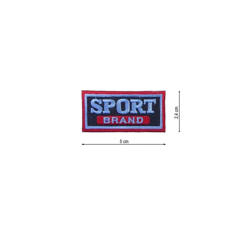 Parche bordado con forma rectangular y frase Sport Brand en su interior. Dimensiones: 5cm de ancho y 2,4cm de alto. Para pegar con plancha sin necesidad de coser.