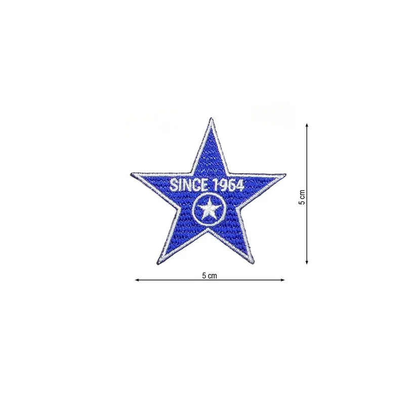 Parche bordado con forma de estrella con frase «Since 1964» en su interior. De 5cm de diámetro. Para pegar con plancha sin necesidad de coser.