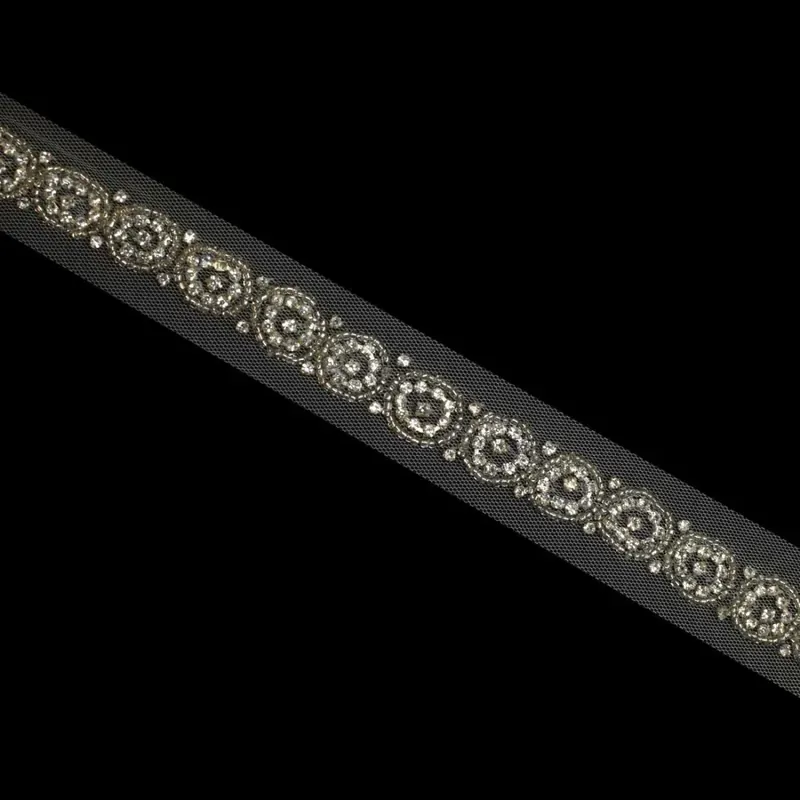 Cinta de pasamanería con pedrería en color blanco y plata. Mide 1.5cm de ancho total. Gracias a esta pasamanería de pedrería podrás decorar y customizar tus prendas o accesorios. Sus pequeños abalorios y cristales harán que tu ropa sea mucho más vistosa y llamativa. Se cose fácilmente a cualquier tejido. Ideal para poner en camisas, vestidos, camisetas, bolsas… Hecho a mano. Precio por metro.