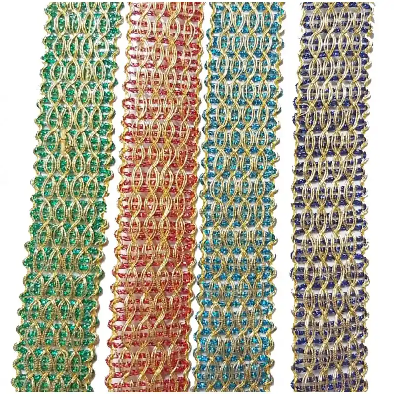 Pasamanería metalizada de 2,5 cm de ancho con un diseño de malabares, perfecta para la confección de disfraces y otros proyectos creativos. Se presenta en varios colores metalizados como azul turquesa y azul. Se vende por metros, siendo cada unidad un metro.