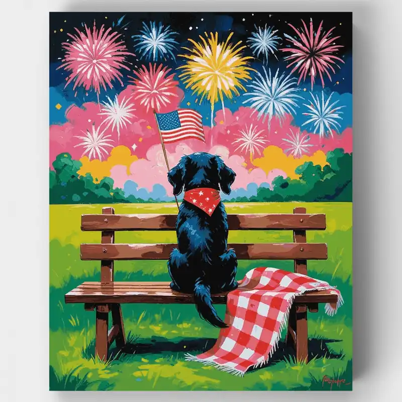 Transforma tu espacio creativo con este emotivo pintar por números kit que presenta un leal perro negro sentado en un banco de madera, sosteniendo orgullosamente una bandera americana mientras observa un espectacular espectáculo de fuegos artificiales del Cuatro de Julio. La escena captura la esencia de la celebración patriótica con vibrantes explosiones de fuegos artificiales rosa, azul, amarillo y blanco iluminando el cielo nocturno, mientras que una manta de picnic a cuadros rojos y blancos añade un toque encantador a este momento completamente americano.¿A Quién Le Encantará?Este kit es perfecto para entusiastas del arte patriótico, amantes de los perros, y cualquiera que disfrute celebrando las fiestas americanas a través de la expresión creativa. Ya seas un principiante buscando un proyecto significativo o buscando un regalo considerado para alguien que ama tanto las mascotas como los temas patrióticos, este pintar por números kit ofrece una forma relajante de crear una hermosa pieza de arte americana. ¡Comienza a pintar tu camino hacia una obra maestra que celebra el espíritu de libertad y amistad!