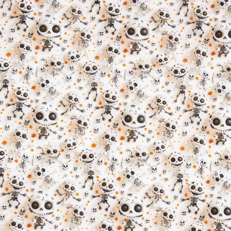 Tela de popelín de algodón con estampado digital de dibujos “terroríficos” infantiles de esqueletos, un estampado con leve sombreado para un efecto 3D vivo en multicolores.