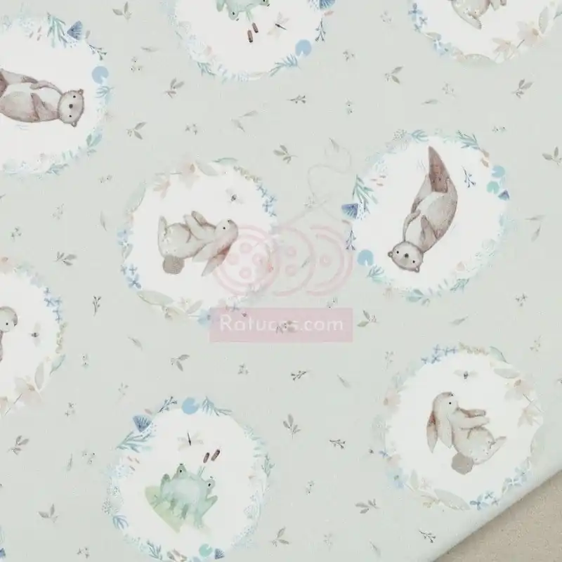 Tela de popelín / popelina con estampado de conejos, nutrias, ranas y otros animales dentro de medallones.