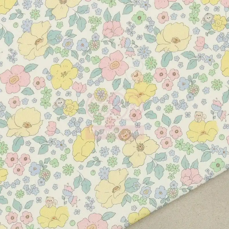 Tela de tejido plano de popelín de composición 100% algodón y estampado de flores en tonos amarillos con toques en rosas y unos pequeños leones camuflados en el estampado.