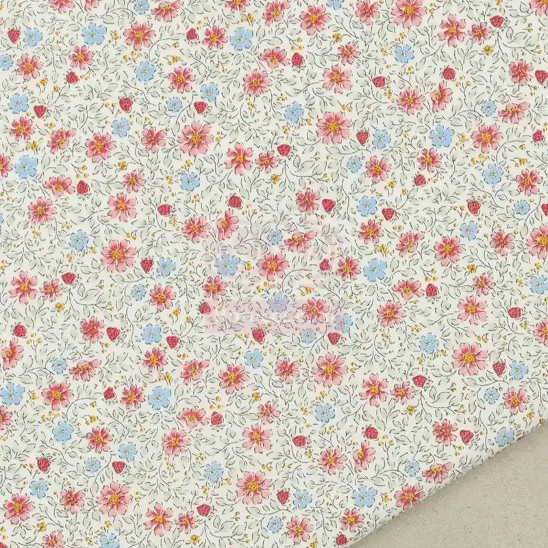 Tela de tejido plano de popelín de composición 100% algodón y estampado de pequeñas flores en tonos rosados y azules con hojitas en verde agua.