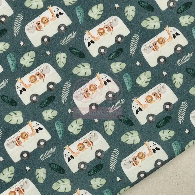 Tela de popelín de algodón, con estampado de animales en una furgoneta.