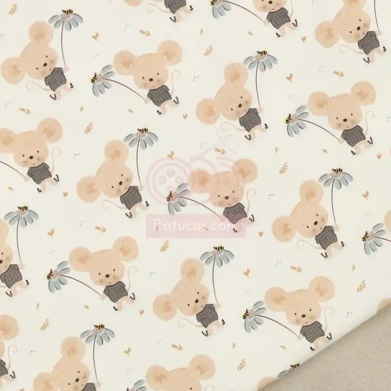 Tela de popelín estampada con ratones y flores.