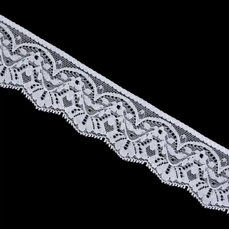 Puntilla de nylon disponible en color blanco, color negro y color marfil. Mide 4cm de ancho. Esta puntilla de nylon es un encaje perfecto para customizar todo tipo de prendas o accesorios del hogar. Ideal para coser sobre vestidos, camisas, camisetas, blusas, mantas, colchas… Tiene un acabado de gran calidad. Precio por metro.