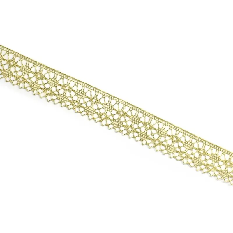 Puntilla metalizada en color dorado. Mide 2cm de ancho total. Es una puntilla muy elegante y sofisticada ideal para todo tipo de usos. Muy utilizada en decoraciones religiosas y sobre todo en época de Semana Santa. Su acabado es de gran calidad. Puede coserse fácilmente a cualquier prenda, accesorio o complemento. Precio por metro.