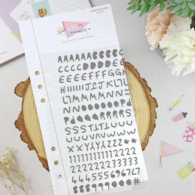 El set consta de 154 pegatinas puffy de letras, para acompañar a los papeles de la colección.