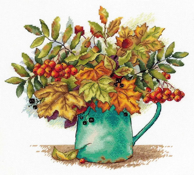 El kit de punto de cruz «Scarlet Bunches of Rowan» de MP Studia presenta una composición encantadora de hojas otoñales y racimos escarlata de serbal en una jarra verde. Ideal para capturar la esencia del otoño en una pieza de bordado.