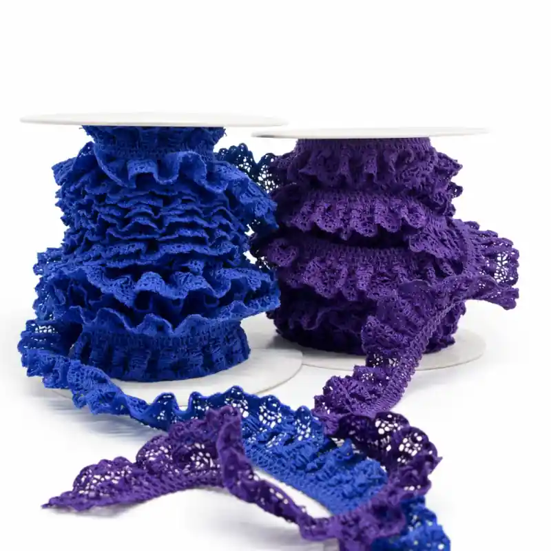 Volante de encaje elástico en tonos azul y morado, diseñado para aplicaciones decorativas y funcionales en trabajos de costura y confección. Su estructura de encaje combina un acabado ornamental con elasticidad, permitiendo una correcta adaptación a curvas y zonas ajustadas.