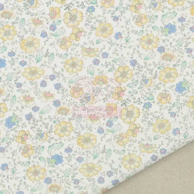 Tela de tejido batista, con estampado de pequeñas flores en tonos amarillos.
